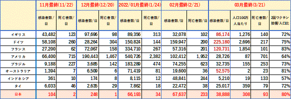 R3/11月〜R4/3月末1週間平均の主要な国のコロナ感染者数推移(WHO)